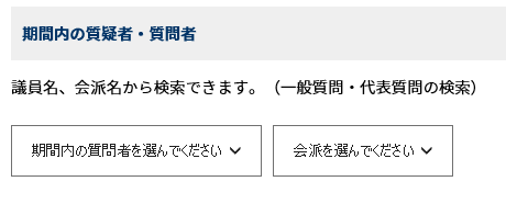 プルダウンメニューに議員名の一覧が表示されます。検索条件に設定する議員を選択してください。選択された議員の発言を検索対象に指定します。 |