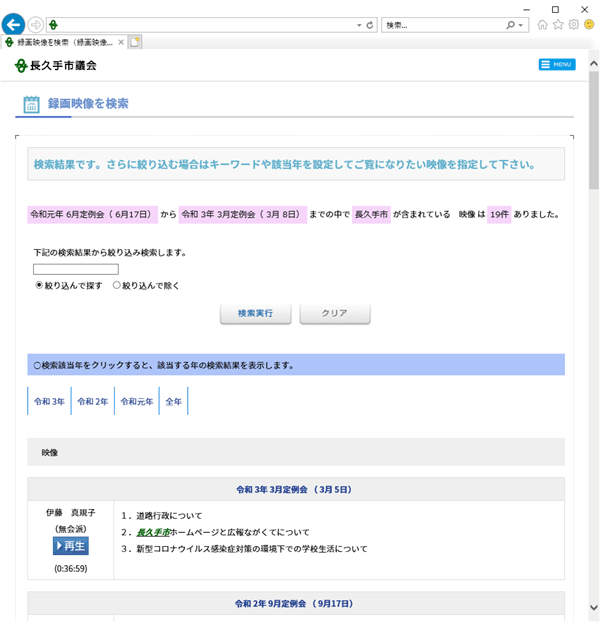 ページ上部には、検索該当年を表示します。クリックした年度の検索結果を表示します。 |