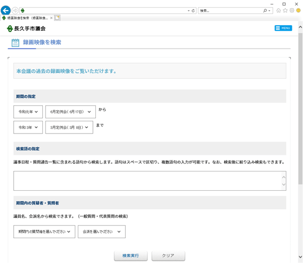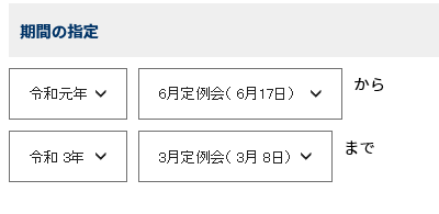 検索したい年度および会議録資料(会議日)で期間を指定します。 |