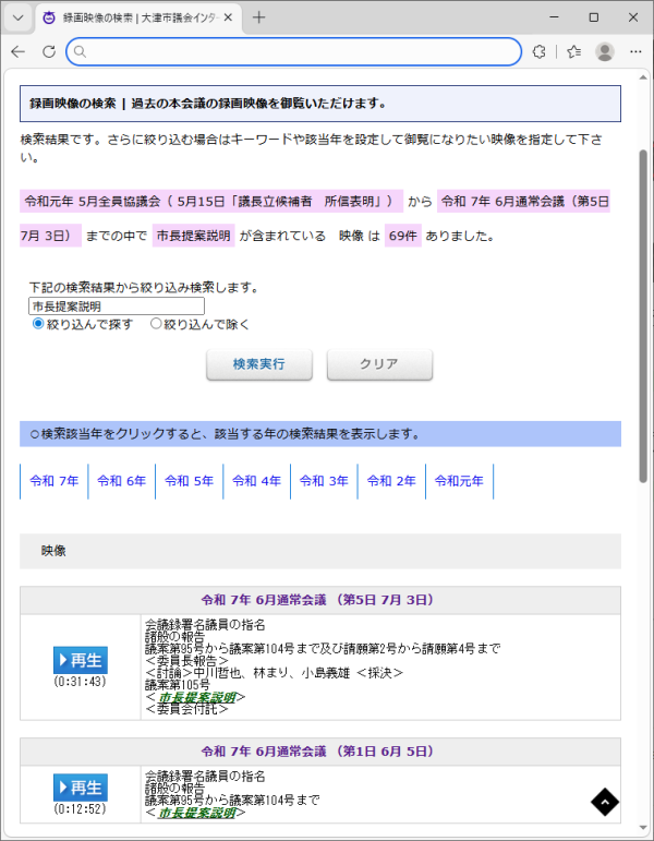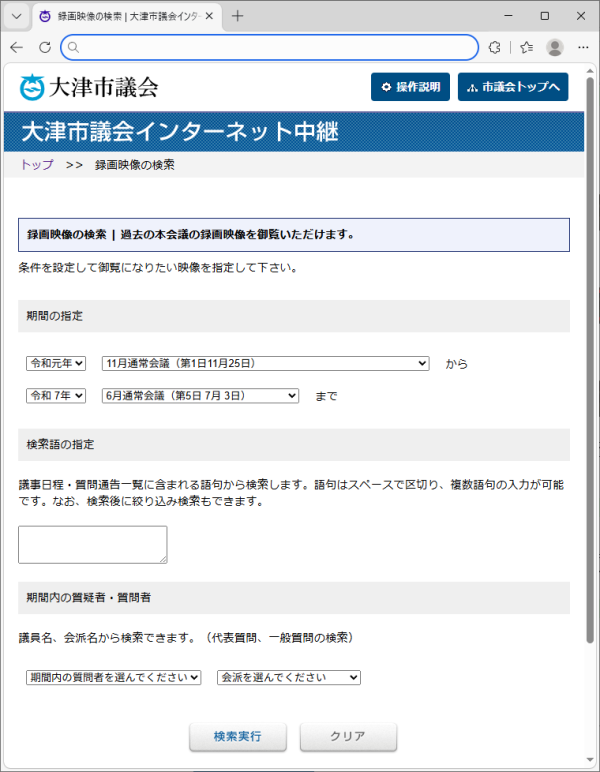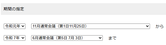 検索したい年および会議名・会議日で期間を指定します。 |
