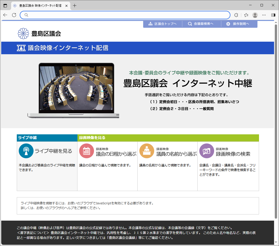 操作説明や、豊島区議会中継ページに関する注意事項を見ることができます。